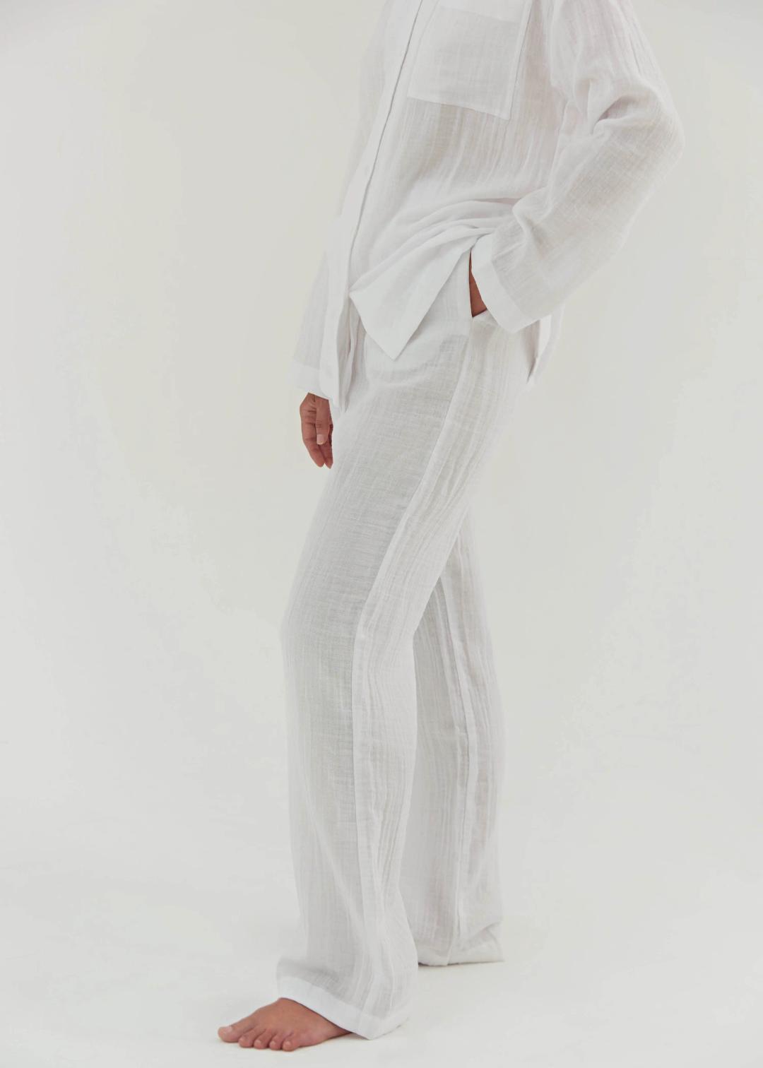 Рубашка с длинными рукавами и брюки из двухслойного премиум-муслина мягкие, комфортные, приятные на ощупь. Рубашка свободного кроя с прозрачными брендированными пуговицами и одним нагрудным карманом. Брюки свободного кроя, с эластичным поясом с завязками на талии и боковыми карманами по внутреннему шву. Прочная ткань из длинноволокнистого египетского хлопка, мягкая и шелковистая, не образует катышков. Усадка 0%. Состав: 100% Хлопок На модели: Рубашка S, Брюки M Рост модели - 173 см Объём груди - 90 см Объём талии - 60 см Объем бёдер - 98 см